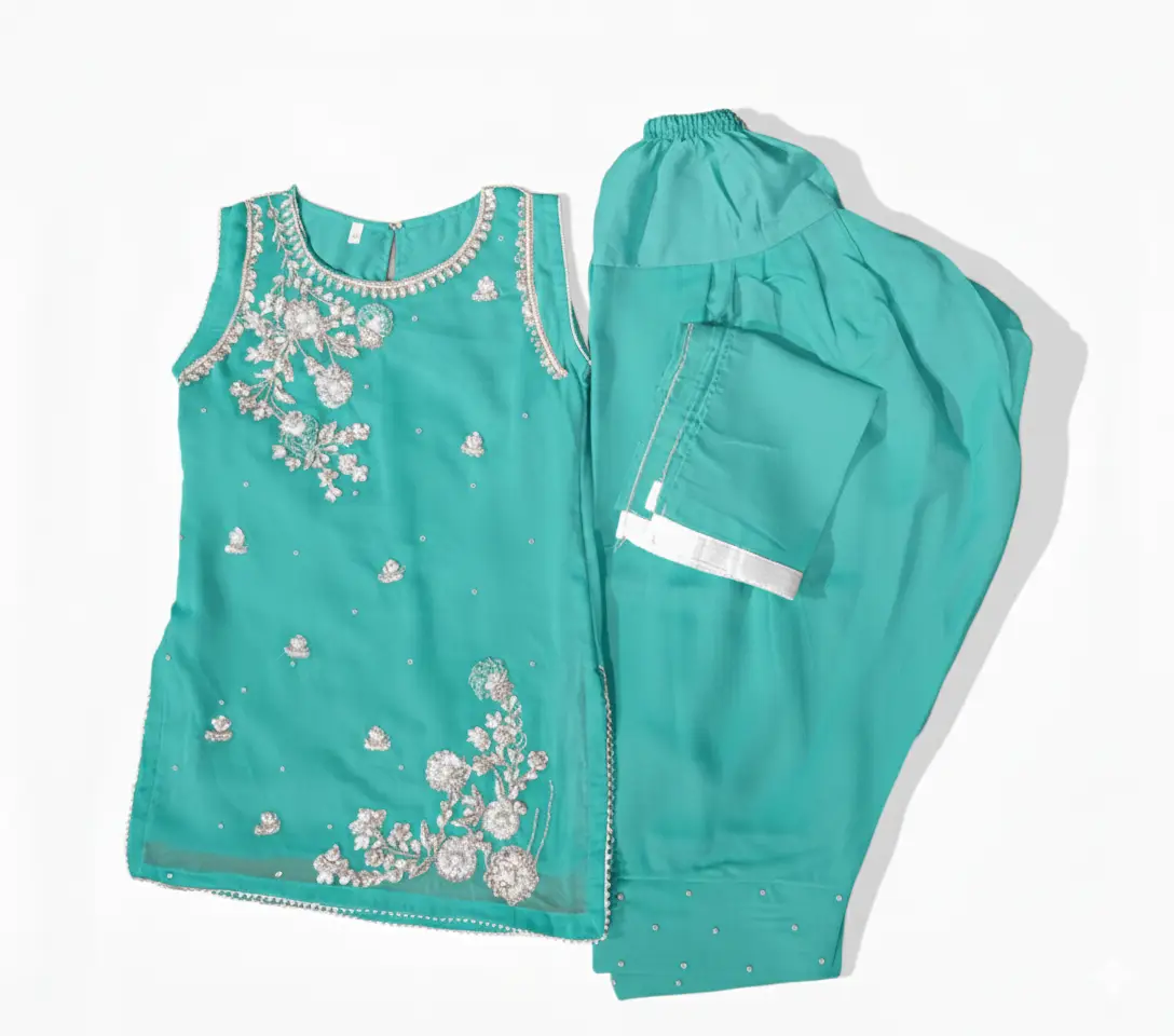 The Sleeves: Comes with Unstitched Chiffon Sleeves featuring matching hand-worked borders. This allows you to customize the length and style (straight, bell, or fitted) according to your preference.