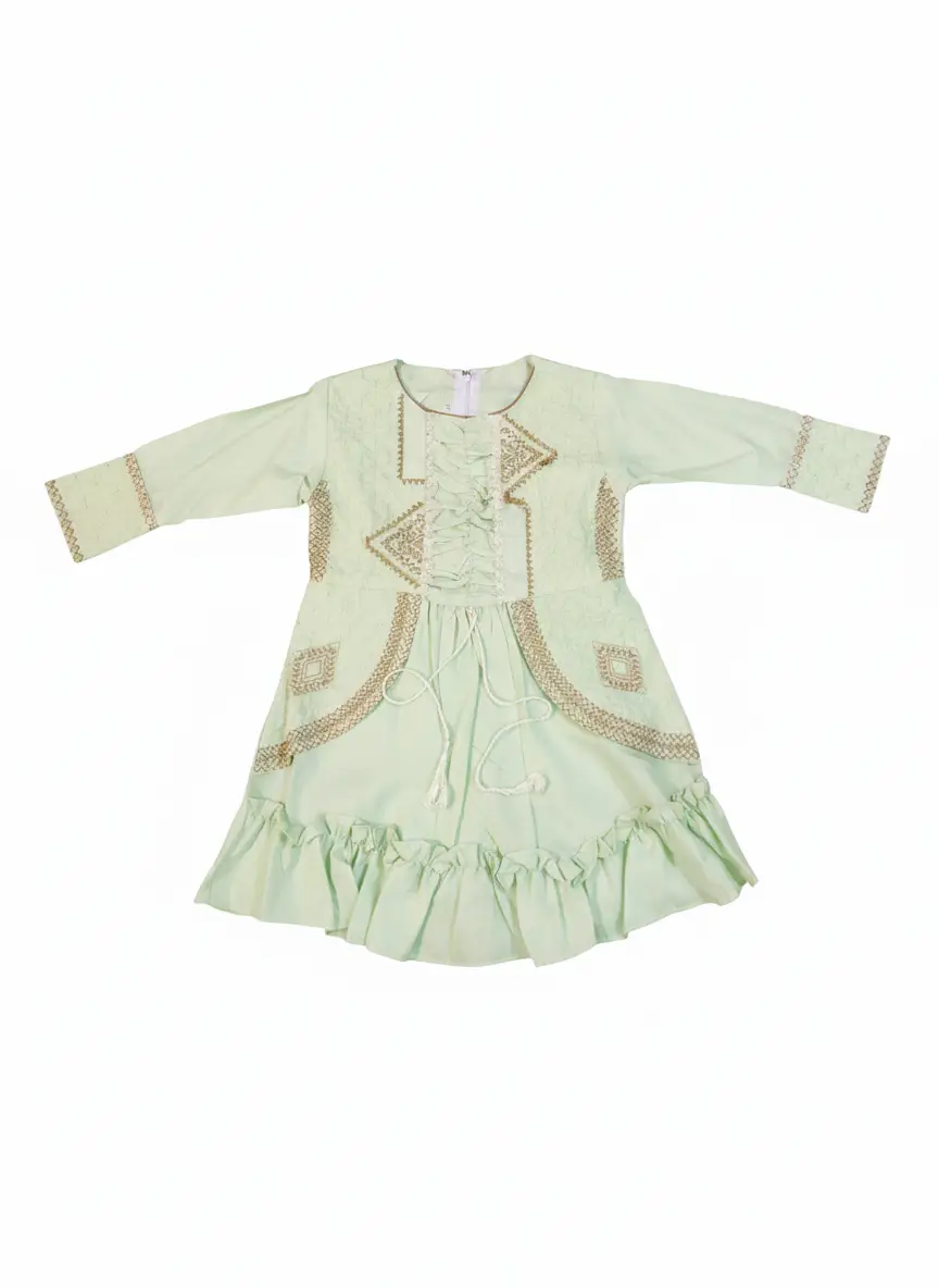 Elevate her style with the GulChic Mint Blossom 2-piece set. Featuring a refreshing pistachio green cotton base, this outfit boasts intricate gold hand-embroidery on the bodice and a trendy ruffled hem. This ensemble includes a Short Frock and Matching Straight Trousers, making it the perfect blend of comfort and “fancy” boutique style for any festive occasion.