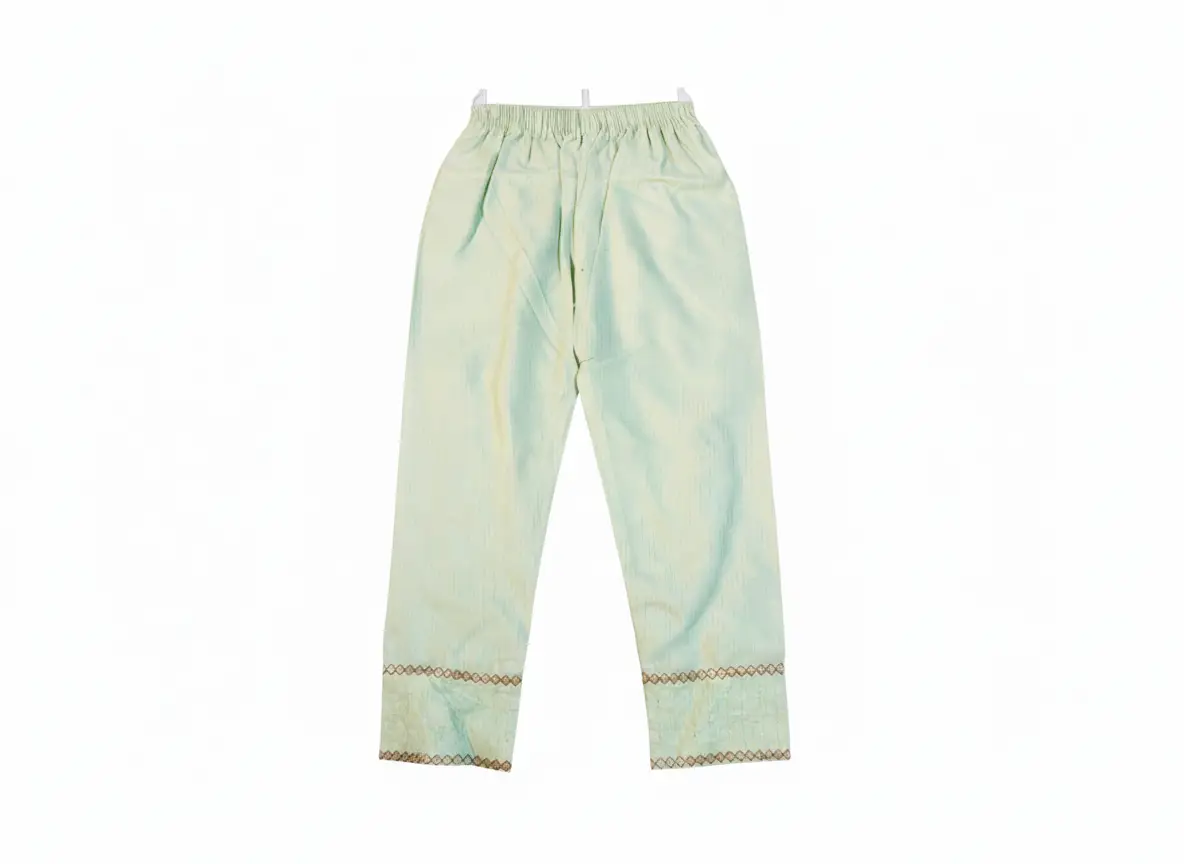 The Trouser: A sleek, straight-cut trouser with matching embroidered borders at the hem to complete the sophisticated look.