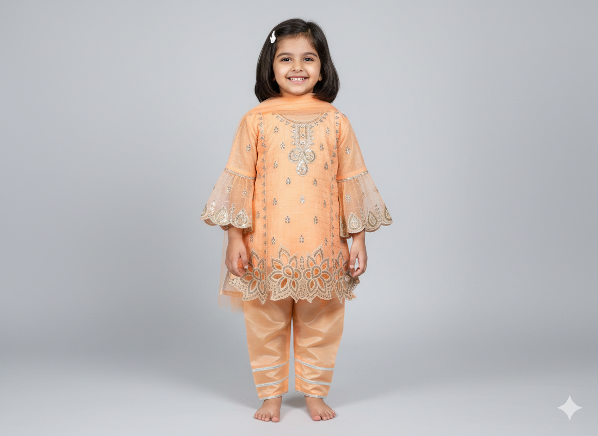 • The Dupatta: A simple, lightweight net dupatta in a matching sage hue, designed to be easy for children to carry while completing the formal look.