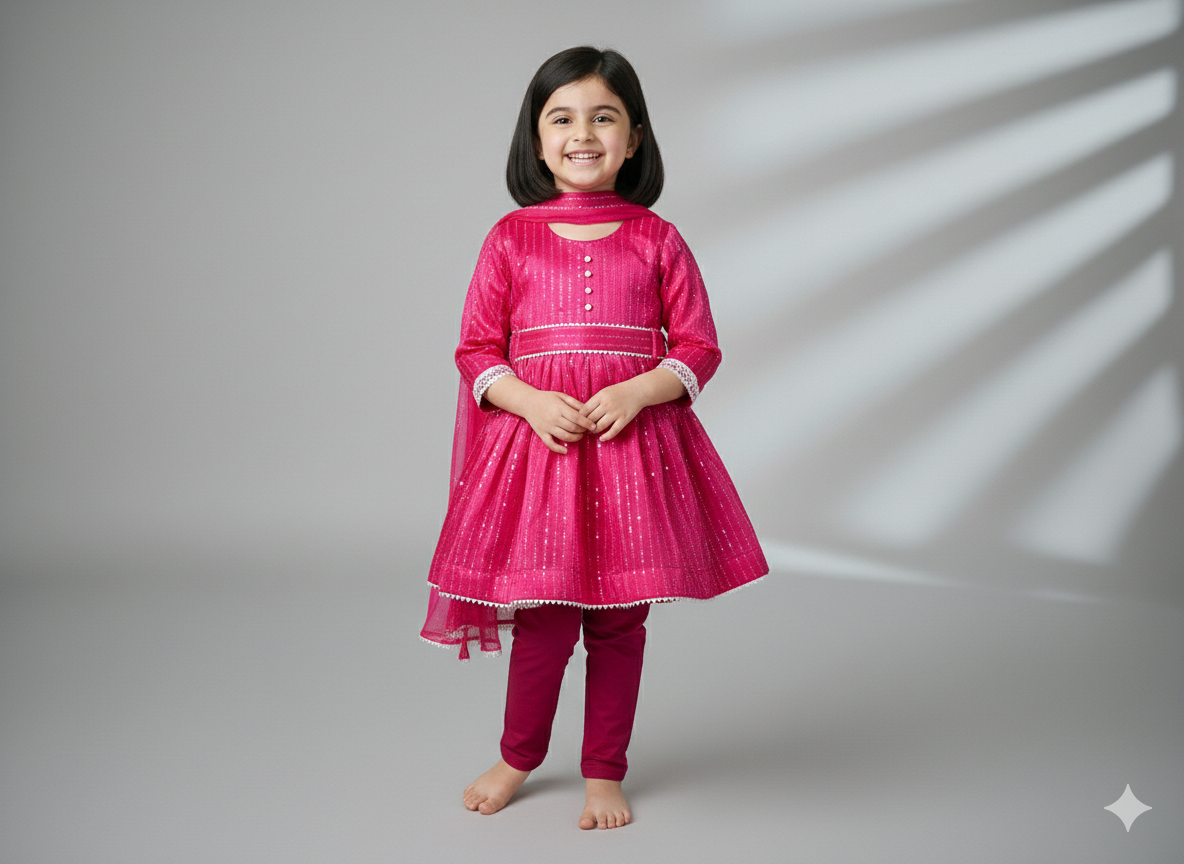 Let her shine in the GulChic Shimmer Glow 3-piece set. This ensemble features a high-volume flared frock crafted from premium metallic shimmer silk with vertical sequin-line detailing. Complete with a matching belt, straight trousers, and a soft dupatta, this set comes in two eye-catching shades: Vibrant Magenta and Dusty Rose.