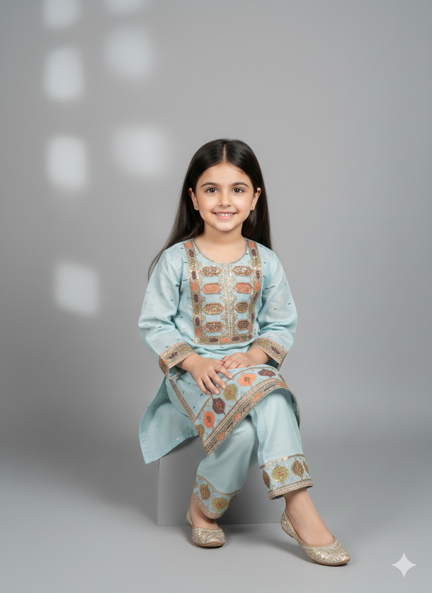 Let your little girl shine in our Zari-Bloom Aqua set. This outfit is meticulously crafted to balance traditional aesthetics with a lightweight feel, making it ideal for weddings, Eid, or formal family gatherings. The shirt features a heavily detailed neckline and border, complemented by a soft dupatta and straight-fit trousers.